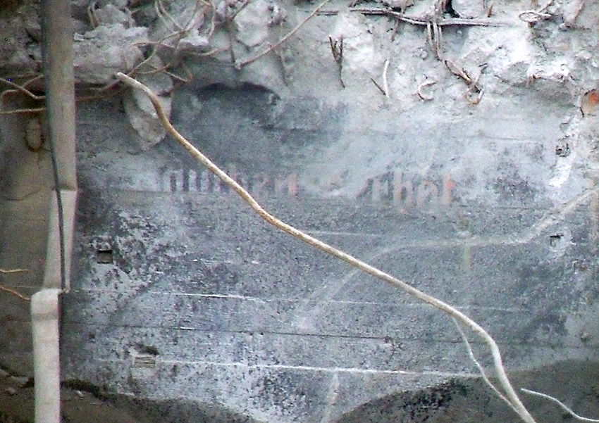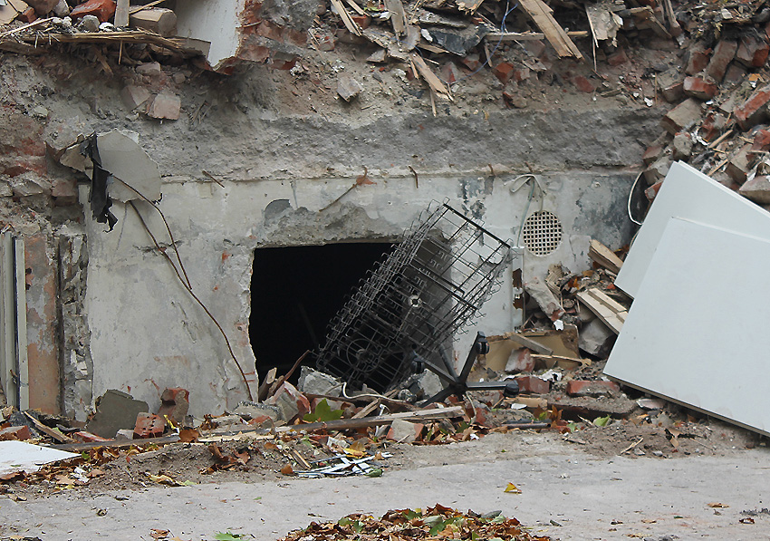 Dies ist mit aller Wahrscheinlichkeit das Gebäude, welches ich als Kind sah: Wohl etwas nach dem Aufnahmedatum des Bildes, als es für den folgenden Abriss bereits entkernt wurde und Wände herausgebrochen waren. Siehe folgende Montage.