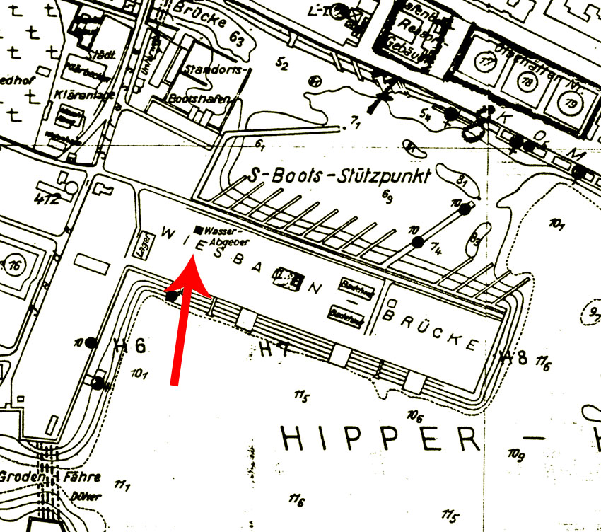 Im Übersichtsplan für die Schiffsliegeplätze von 1942 wird das Objekt als Wasser-Abgeber aufgeführt. Das passt zum Wasserkran. Weiterhin ist damit so gut wie erwiesen, dass sich die Anlage im Zweiten Weltkrieg wohl noch in Betrieb befand.
