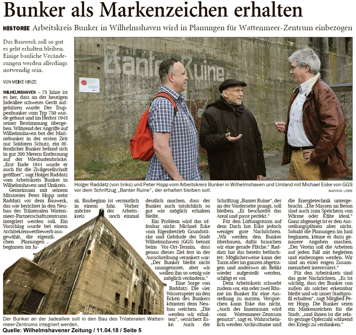 Heute erschien in der Wilhelmshavener Zeitung eine interessante Pressemitteilung des Vereins zum Erhalt der Bunker am Banter See e.V.: