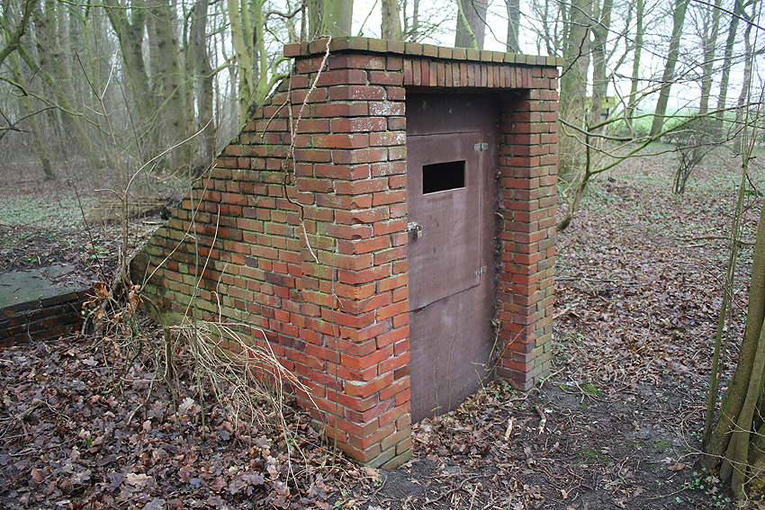 Aufnahmen des Erdschutzraumes am "Carlshof" westlich vom Schloss Gödens konnten nun eingefügt werden. Es geht zunächst im Eingangsbau nach unten, dann nach links in die Schleuse, die mit zwei Türen gesichert war. Dahinter liegt nach rechts abgehend der Hauptraum, der sich komplett unter Erdgleiche befindet. Die Sitzgelegenheiten im Inneren waren im Gegensatz zu anderen Bauten dieser Art aus Stein gemauert. Heute steht das Objekt unter Wasser und dient seit etwa 2011 als Fledermausquartier. Unser herzlicher Dank an die freundliche Anwohnerin für die Informationen. Hier