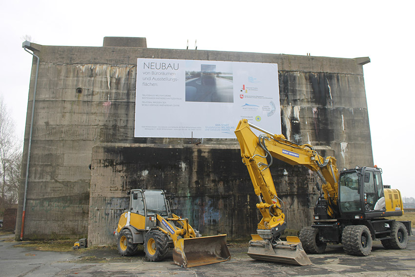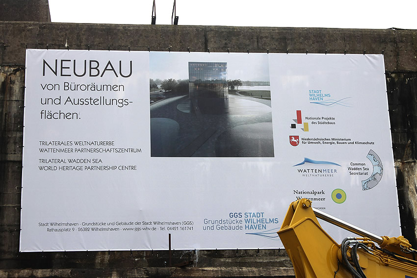Gestern, am 23. März 2018 fand der symbolische erste Spatenstich zum Bau des "Trilateralen Weltnaturerbe Wattenmeer-Partnerschaftszentrums" statt. Ein großformatiges Plakat wurde an die Nordwand des Bunkers gehängt. Baumaschinen stehen bereit. Zunächst wird nun damit begonnen, das umliegende / anliegende Gebiet zu sondieren und von Altlasten zu befreien. Auch nach Kampfmitteln wird gesucht. Hier