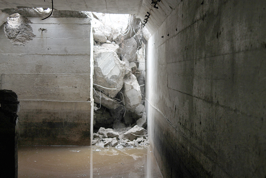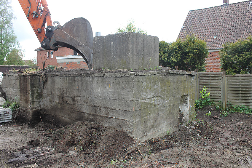 Bunker Banter Ruine. Die Zerstörung der Deckenverstärkung samt Wasserspeier (einer ist bereits beim Aufprall auf den Boden vernichtet worden) und Lüftungsturm (komplett zerstört) hat am 16. Juni begonnen.