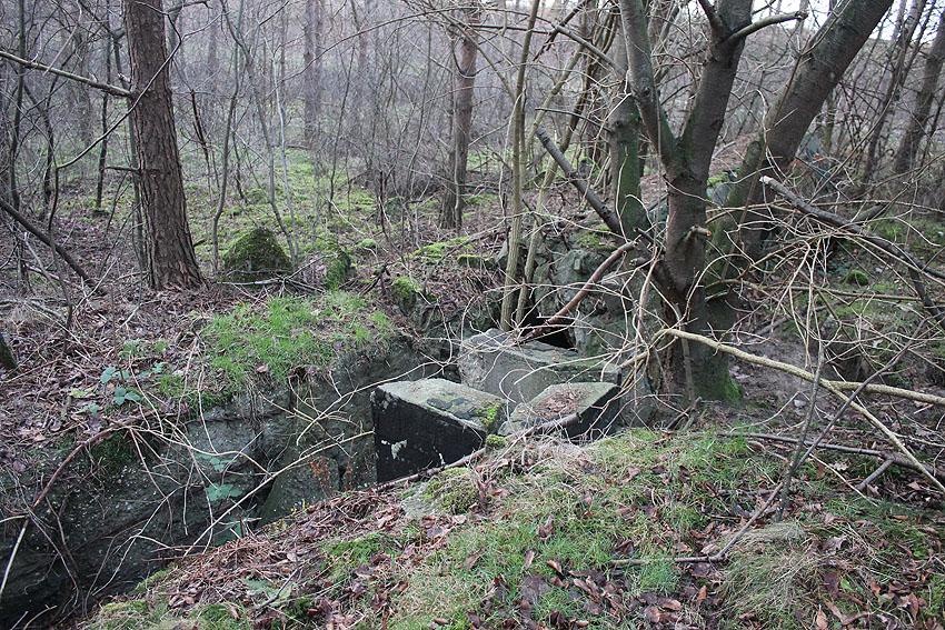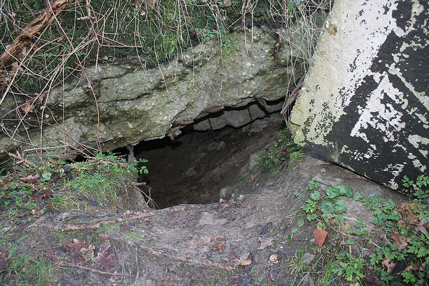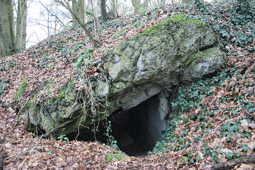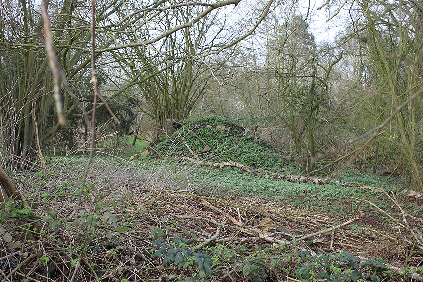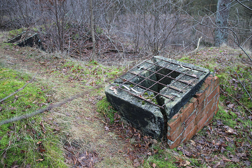 Erdbunker-Neuentdeckung trotz Corona: Hessenser Weg 31 / zwischen Grundstück B und C - Der kleine Erdschutzraum wurde zu Kriegsbeginn als Splitter- und Trümmerschutz für das anliegende, noch heute vorhandene größere Wohnhaus errichtet. Neben dem Luftschutzraum befand sich ein weiteres kleineres Haus, welches nach dem Krieg (wohl bereits 1946) entfernt wurde. Auch für dessen Bewohner wurde die Anlage erbaut. Etwas weiter östlich befindet sich ein "Behelfsgebäude", das nach der verheerenden Explosion im Marine-Artilleriedepot gegenüber auf der anderen Kanalseite (1943 durch Luftangriff) eigens für obdachlose Bürger aus der Nähe errichtet worden war. Der kleine Schutzbau steht nach Hinweisen eines Anwohners unter Wasser. Heute (wie auch seinerzeit teilweise) ist hier Kleingartengelände. Hier