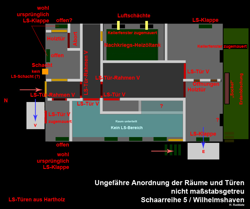 Aktuelles zum LS-Keller Schaarreihe 5: Es handelt sich bei der Erdaufschüttung um keine Überdeckung eines Splitterschutzbauwerkes. Der Luftschutzkeller verfügte an der Nordseite nahe der Westecke über einen Splitterschutzeingang. Dieser ist noch heute überbaut mit einem Nachkriegs-Treppenhausanbau vorhanden. Ein zweiter Schutzvorbau befand sich vorm Notausstieg an der Westwand nahe der Südecke.