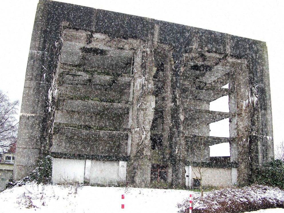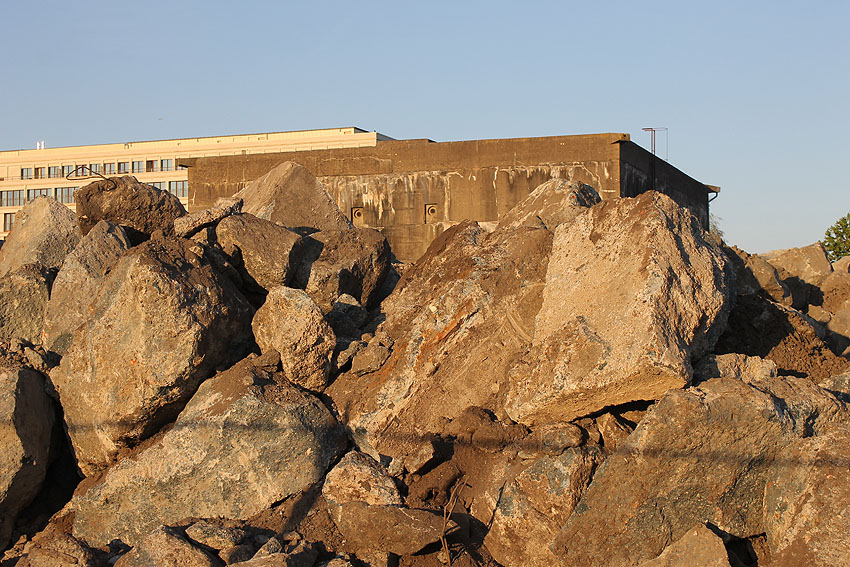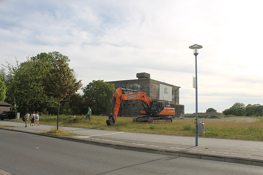 Bunker 2 hinter dem Innovationszentrum wurde trotz mannigfaltigem Protestes völlig sinnfrei abgerissen. Der Oldenburger Investor, der dort bauen wollte, sprang zügig wieder ab. Wer hätte auch in dem "Verpuffungsgefahrenbereich" überhaupt wohnen wollen? Die Zerschellerplatte und Fundamentplatte des Bunkers verblieb nach doppelt so langer Abrissdauer wie vorgesehen im Boden. Dort werden nun alljährlich Osterfeuer veranstaltet. Deutschlands teuerster Osterfeuerplatz. - Abgerissen für einen sechsstelligen Betrag inklusive Sondergelder für notwendige Lockerungssprengungen... War das nötig? Hätte man daraus nicht einen Kletterparkkubus mit Dachterrasse machen können? Aber nein. Ein Wilhelmshaven-Beispiel kompletter Ignoranz zur Geschichte.