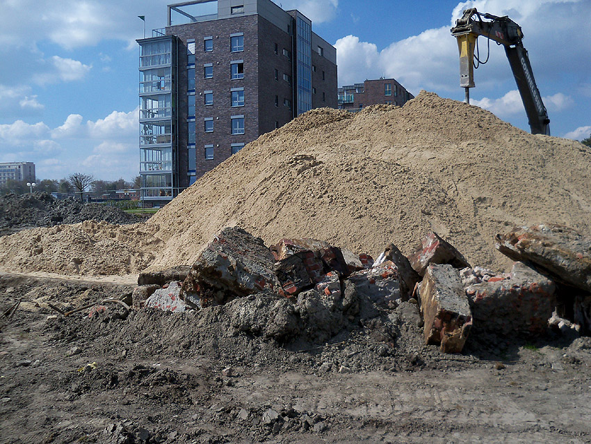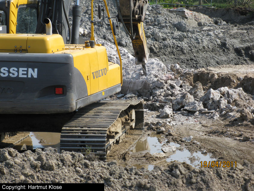 Erste Aktivitäten auf der Baustelle, das Erdreich südlich des Fundamentes wurde mit etwa einem Meter Tiefe entfernt und auf dem Fundament abgelagert. Diverse Rohre und andere Metallgegenstände, Relikte aus der Vergangenheit, wurden unter Erdgleiche aufgefunden. Ein leicht öliger Geruch ist am Gelände wahrzunehmen.