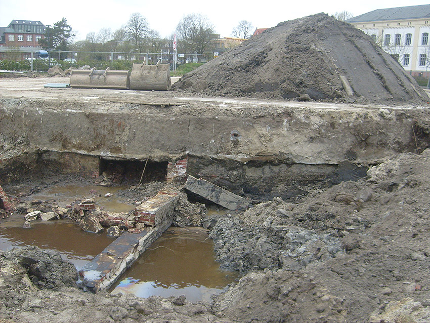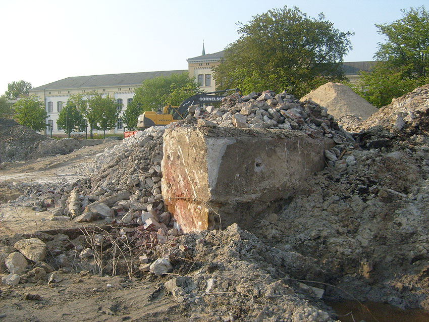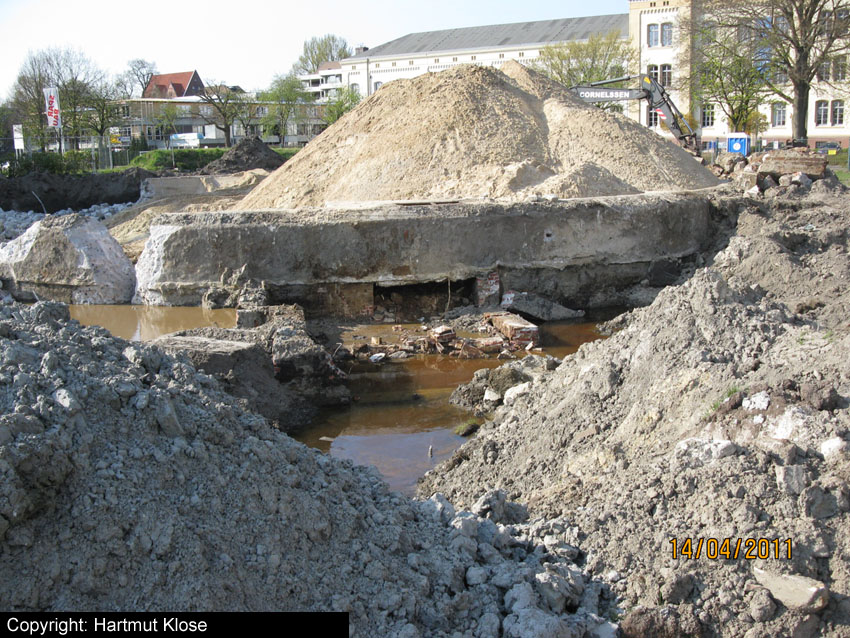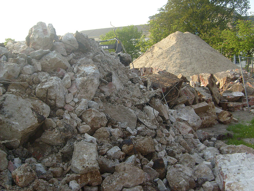 Das Tankfundament ist so gut wie beseitigt. Die Gründungsholzpfähle, beziehungsweise deren Reste verbleiben weiter im Erdreich. In den nächsten Tagen wird der Restschutt abgefahren. Dann ist alles bereit für die Errichtung eines neuen, hübschen Wohnbunkers, die Lücke in der Promenade wird damit dann geschlossen sein.