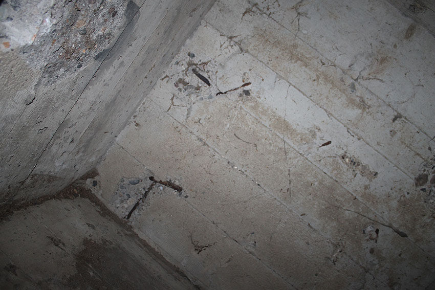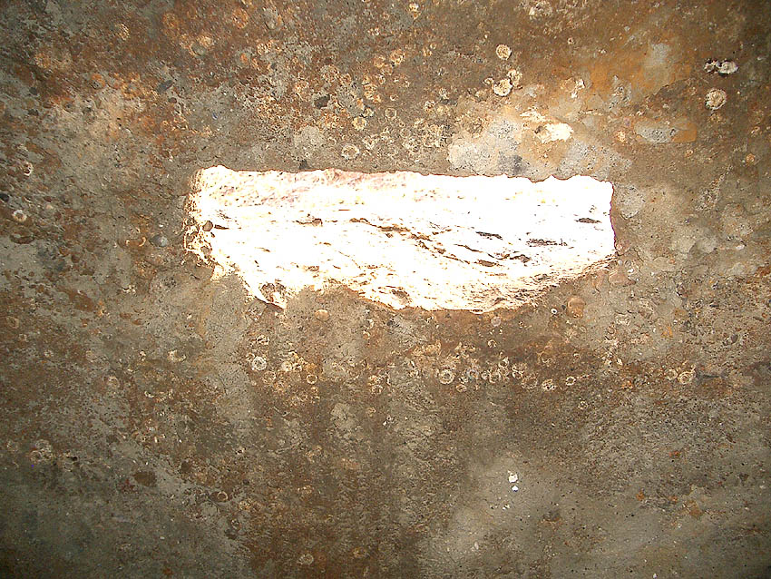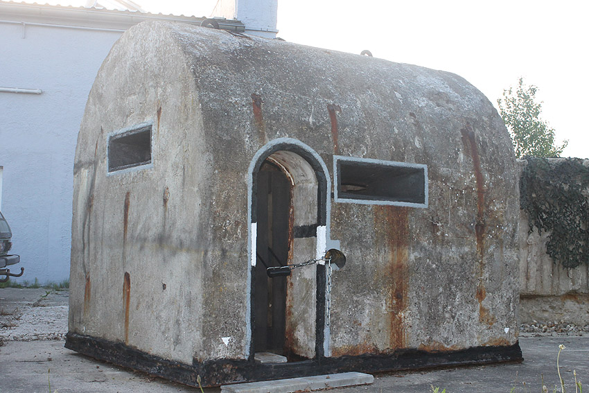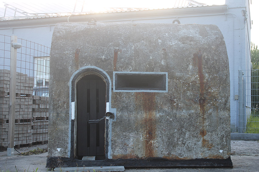 Wir vermuten, dass der Splitterschutzunterstand zusammen mit den Splitterschutzzellen, welche meist auf der Bauwerft standen, aus einer Produktionsserie stammt. Die Form der Türen ist identisch. Auch wird der Unterstand ursprünglich eine Hervorhebung des Metallkäfigs für die Stahltür gehabt haben (siehe Foto Zelle). Diese Hervorhebung wurde mit der Tür nachträglich beim Herausschweissen einiger Stahlkäfigbereiche entfernt. Es könnte auch sein, dass Stahlblenden im Verbund mit dem Käfig, wie bei den Splitterschutzzellen, im Sichtschartenbereich vorhanden waren.