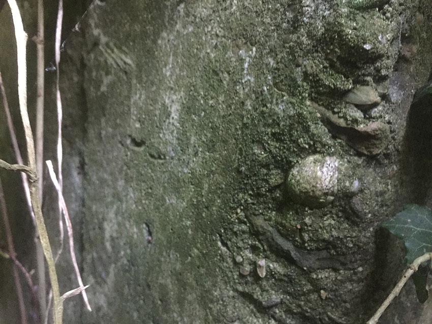 Der Betonblock im Notausstiegsbereich ist von allen Seiten verschlossen. Entweder wurde er nachträglich vor den Ausstieg gesetzt (unwahrscheinlich), oder ein, bzw. zwei seitliche Ausstiege wurden nach dem Krieg zugemauert und verputzt. Davon ist allerdings nichts mehr erkennbar... Ehemalige Öffnungen lassen sich höchstens erahnen. Oder befand sich im Block direkt vorne an der Längsseite eine Öffnung?