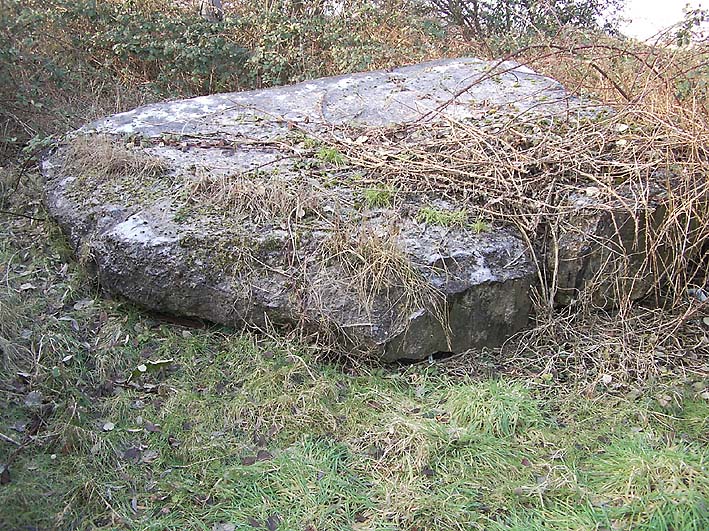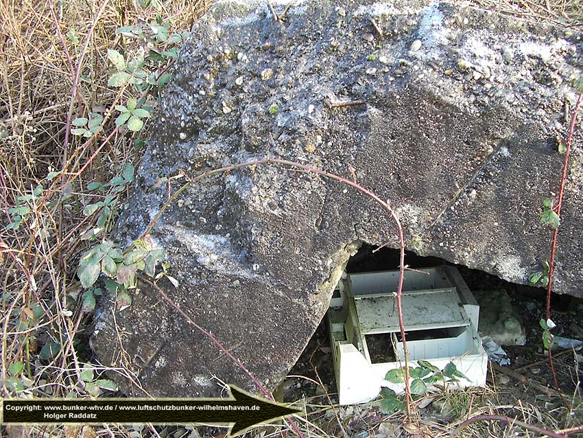 Das einzige große erhaltene Trümmerstück auf der Fundamentplatte / Zerschellerplatte muss aus dem Inneren des Turmes stammen, vielleicht Teil einer Decke / Trennwand? Es könnte auch sein, dass dies die innere Prellwand der Gasschleuse eines der Eingangsbereiche war. Die Wand wäre dann aus dieser Blickrichtung nach vorne auf den Boden gekippt. Das Trümmerstück entspricht in seiner Tiefe einer Geschosshöhe...