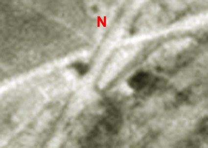 Bild oben: Unten rechts sind zwei Objekte links und rechts der Straße erkennbar. Was dies für Gebäude waren, ist noch unklar. Aber genau am linken Objekt befindet sich der Erdschutzbau, bzw. ist das linke Objekt eventuell der Schutzbau mit Gebäude-Überbau? An den Pfeilen sind die anliegenden Munitionsbunker in / an den dortigen Wällen ersichtlich.