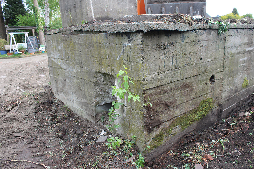 Nachtrag Mai 2020: Dies ist die untere Hälfte vom Eingangsbau des Deckungsgrabens Am Tief / Verbindungsstraße. Der Oberbereich wurde nach dem Krieg entfernt. Der Graben wurde Ende April bis Anfang Mai 2020 über Erdgleiche abgerissen. Interessant: Die nahe Anlage Lindenstraße besteht lediglich im ersten Grabenabschnitt. Der hintere abgeknickte "L-Bereich" wurde für die nachkriegszeitige rückwärtige Erweiterung des anliegenden Wohnhauses beseitigt. Auch der Eingangsvorbau wurde entfernt (für eine Garageneinfahrt). Die Anlagen gehören einer Serie mit zwei Deckungsgräben in Heidmühle und einem in Moorwarfen an. Eine "verdoppelte" Version in Zickzackform existiert noch heute in Middelsfähr, eine weitere Anlage gab es in Sande.