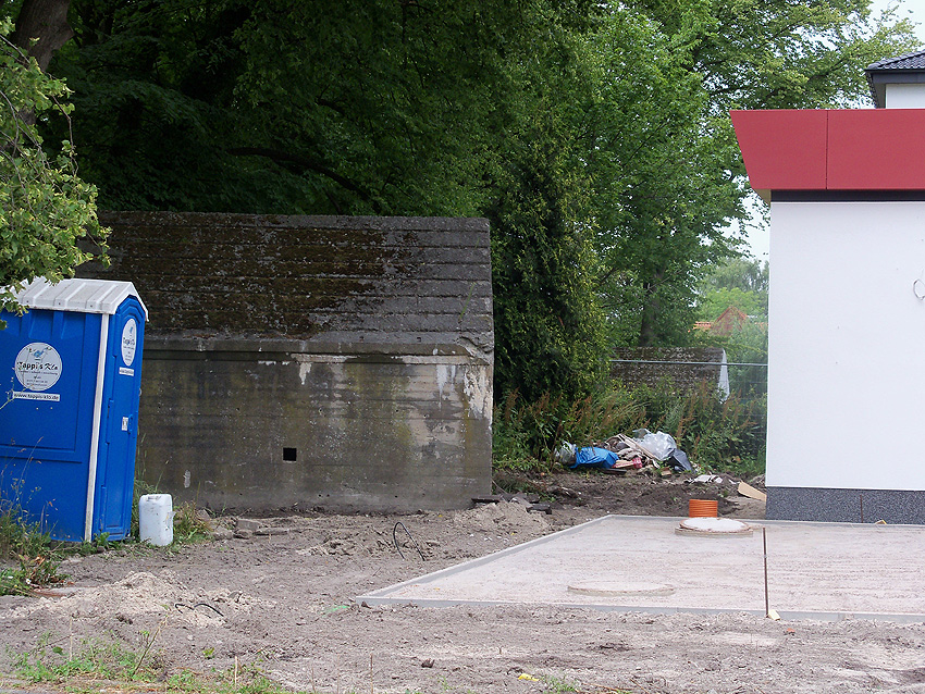 Im Juni 2013 sieht das Gelände der ehemaligen Schule Neuende wie folgt aus. Der anliegende betonierte Deckungsgraben ist glücklicherweise noch immer unversehrt geblieben. Bis auf die Einbringung einer neuen Türöffnung im Nordbereich des mittleren Eingangsbauwerkes soll hier nach unseren Informationen glücklicherweise zukünftig auch nichts weiter geschehen...