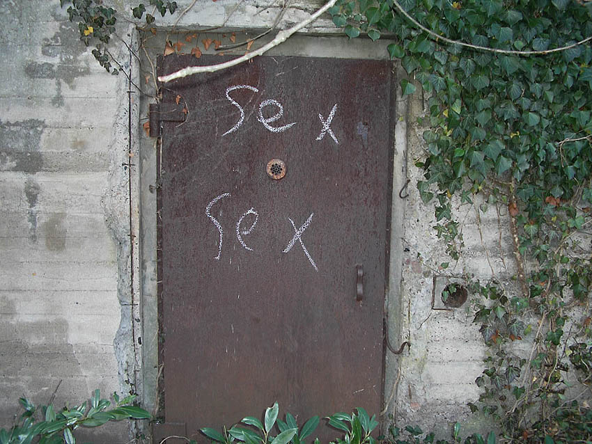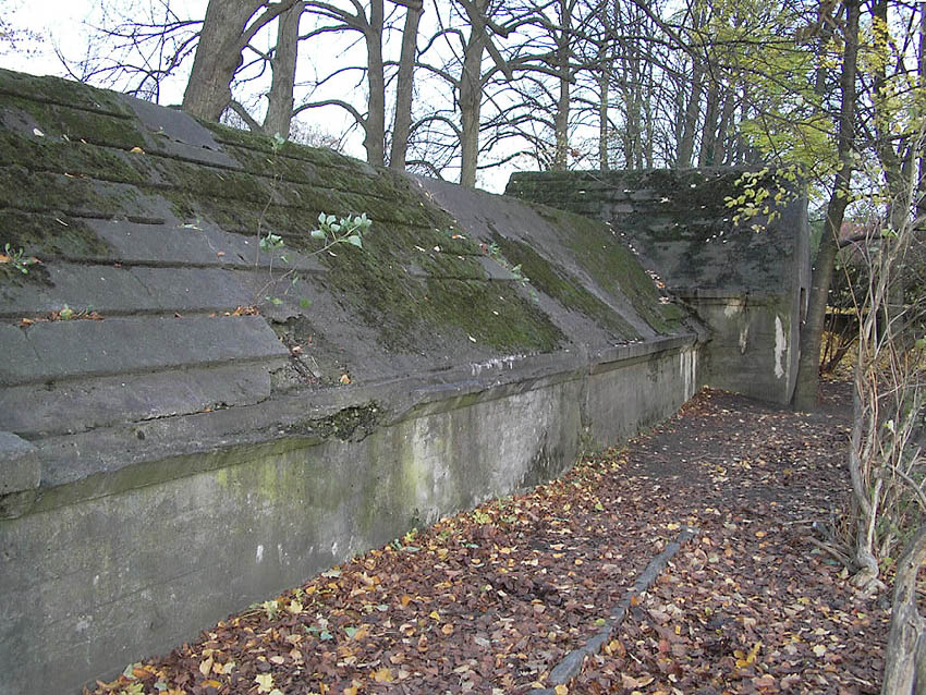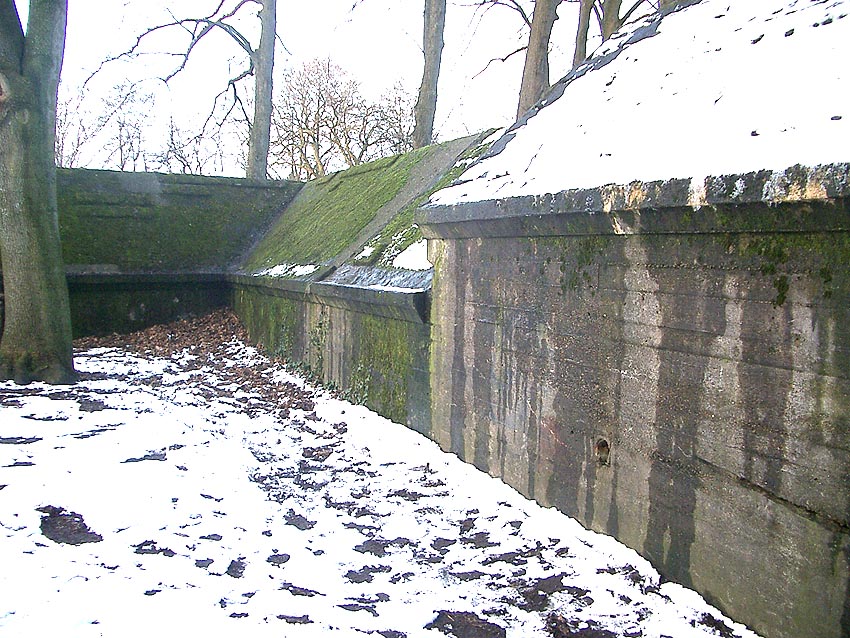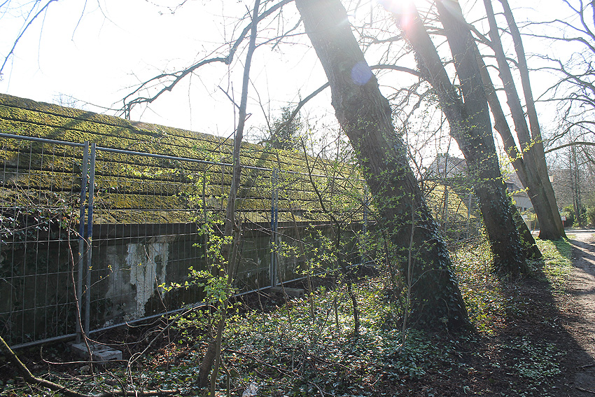 So sieht die ehemalige Schule am 8. Juli 2012 aus. Der Deckungsgraben soll in Zukunft im mittleren Eingangsbauwerk auf der entgegengesetzten Seite nach Norden hin eine neue Öffnung bekommen, damit der Fledermausschutz den Bunker vom öffentlichen Bereich aus betreten kann. Damit wird dann diese Anlage als entfestigt zu bezeichnen sein.