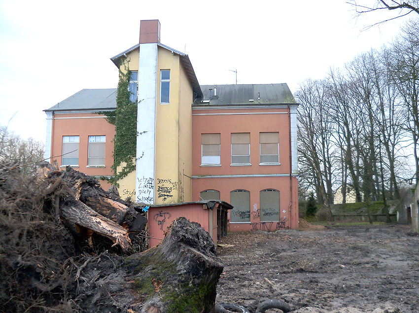 So sieht die ehemalige Schule am 20. Oktober 2012 aus. Nicht unerhebliche Teile des Bauwerkes wurden inzwischen abgerissen. Sieht so Denkmalschutz aus?