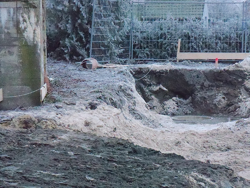 23. Januar 2015: Am Deckungsgraben der ehemaligen Schule Neuende wird nun "gegraben". Vor dem alten, bereits umgebauten Schulgebäude entsteht Neubebauung. Der betonierte Deckungsgraben wird unangetastet bleiben.