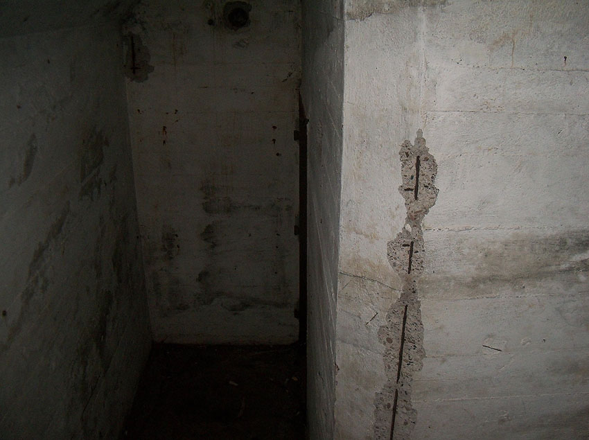 Der mittlere Eingangsbau von innen. Es geht einige Stufen abwärts. Links und rechts befindet sich der zickzackartig mit Druckschutzwänden (Prellwänden) durchzogene Schutzgang. Er liegt bei diesem Deckungsgraben fast zur Hälfte unter Erdgleiche. Der Eingangsbereich diente gleichzeitig als Gasschleuse. Zumindest eine der Türen dieses Eingangsbereiches zum Schutzgang hin wurde, wie hier ersichtlich, nachträglich entfernt.