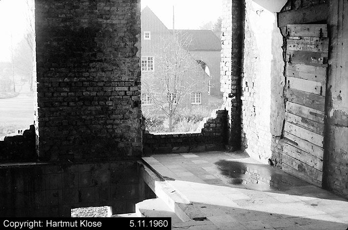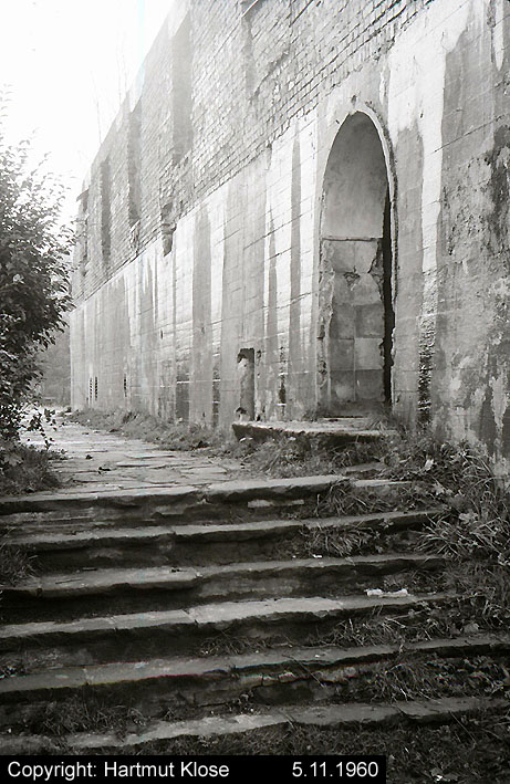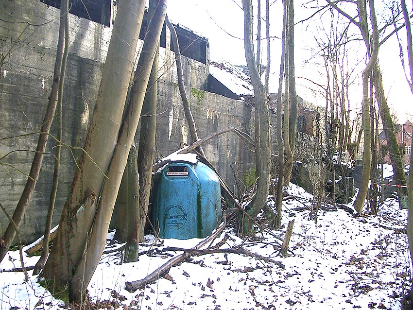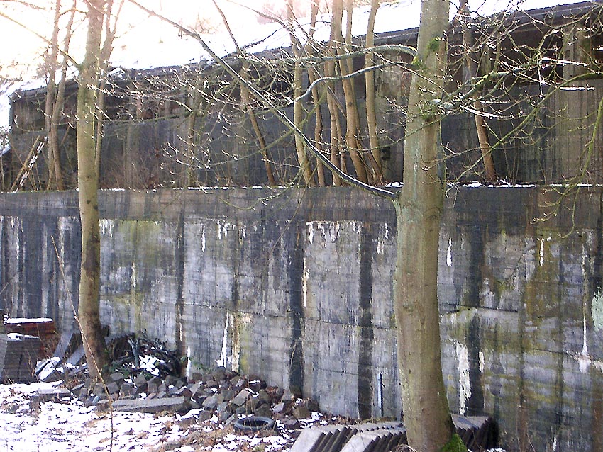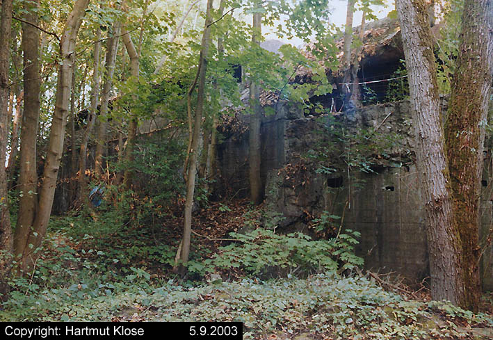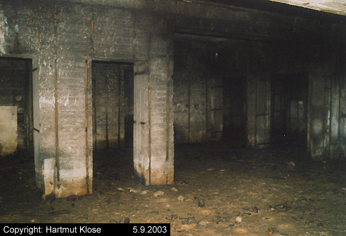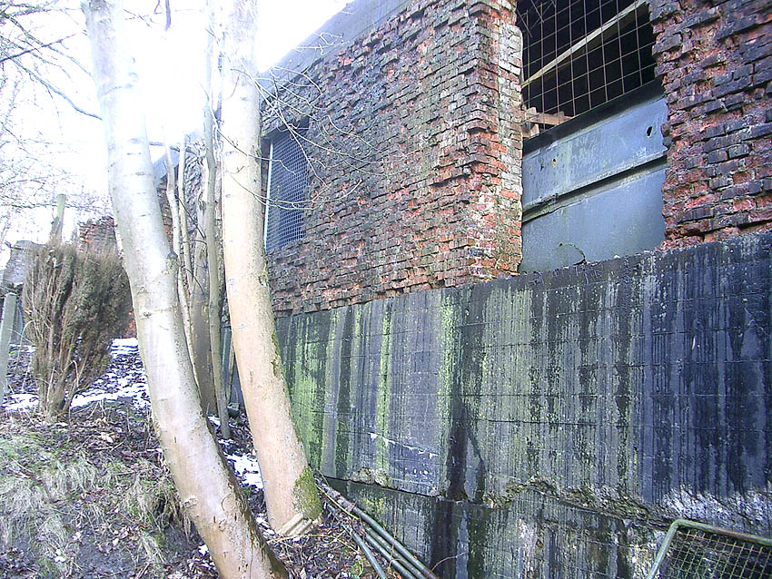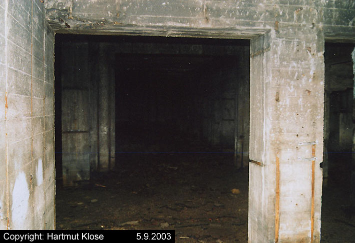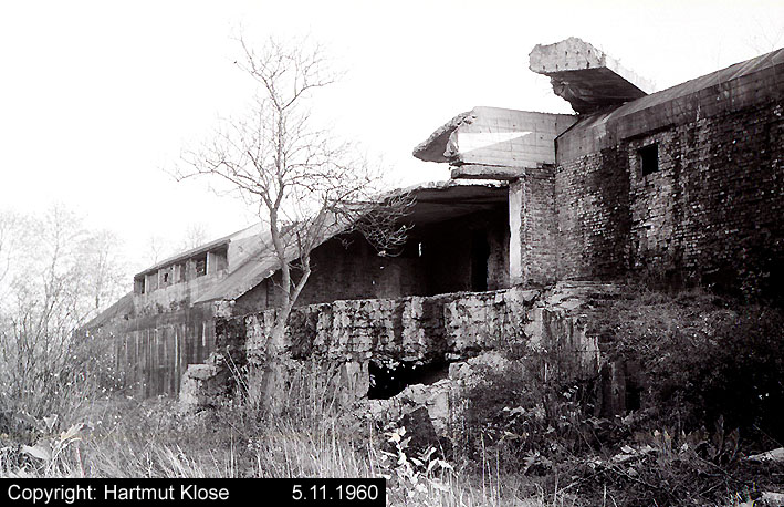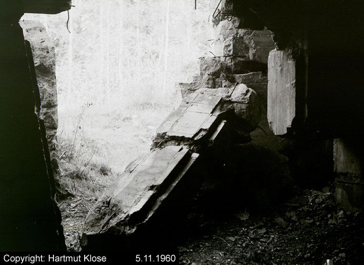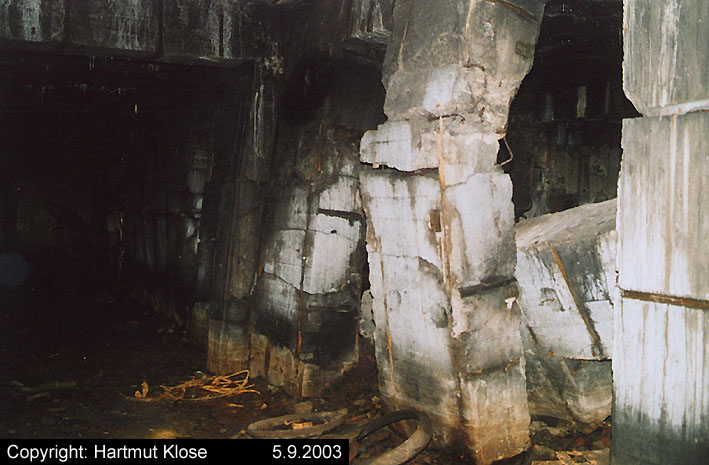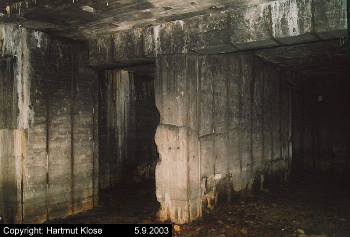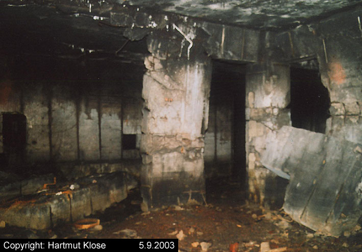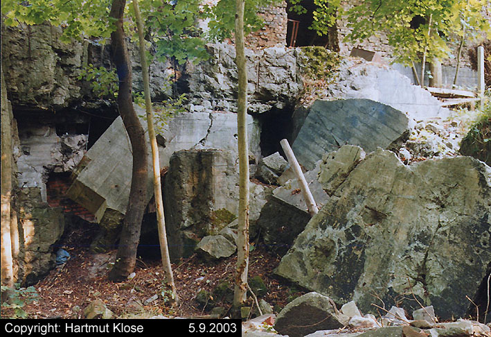 Der gesprengte Bereich an der Westfassade. Hier befand sich ursprünglich ein Anbau mit Beobachterturm und leichter Flakstellung...