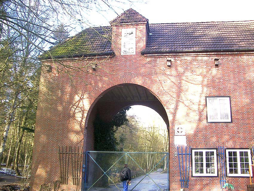 Dieses Bild zeigt den getarnten und verklinkerten Bunker Rosenhügel zwischen 1941 und 1945. Erkennbar ist der nach dem Krieg gesprengte Bereich des Beobachterturmes mit leichter Flakstellung, aufgenommen vom Torbogen des Eingangsbauwerkes zur Flakleitstelle.