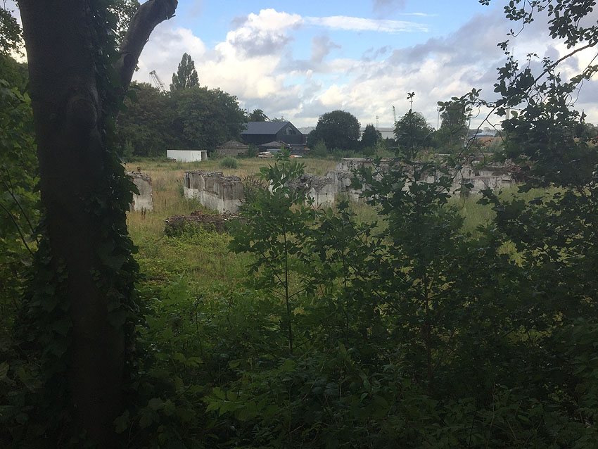 10.04.18: Die Schuttbeseitigungsmaßnahmen waren bereits seit Wochen großteilig wieder ausgesetzt. Kurz vor deren kompletter Aussetzung wurde noch das letzte erhaltene Teilstück des ehemaligen Wohntraktes- Wirtschaftstraktes der Südzentrale in Richtung K.W.-Brücke planiert. Wir berichten hier weiter.