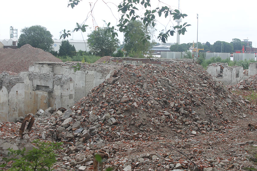 28.05.18: Die Schuttbeseitigungsmaßnahmen sind wieder aufgenommen worden... Nun steht sogar eine Brechmaschine zur Trümmerzerkleinerung auf dem Gelände. Wir berichten hier weiter.