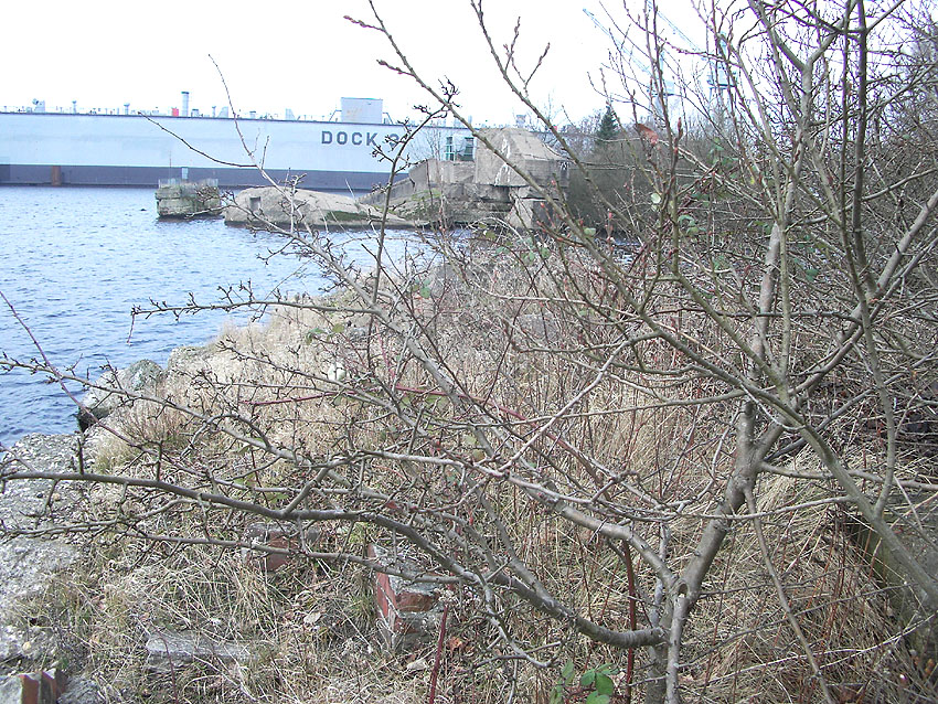 Die Verbunkerung zwischen Dock IV und V. Ein Pumpenhaus, bombensicher geschützt und nach dem Krieg gesprengt.