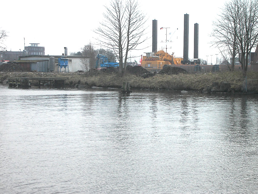 Blick von Osten nach Westen zur Tirpitzhelling. Genau hier am Standort des Fotografen lag das Heck der Tirpitz. Der Bug ragte bis fast an die Gökerstraße hin.