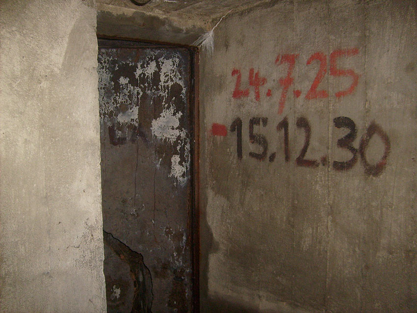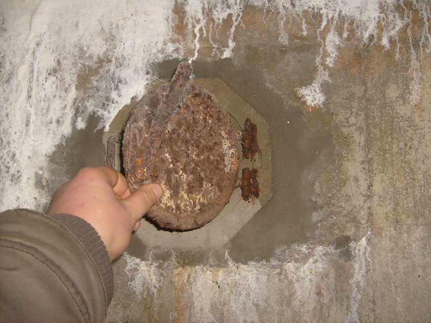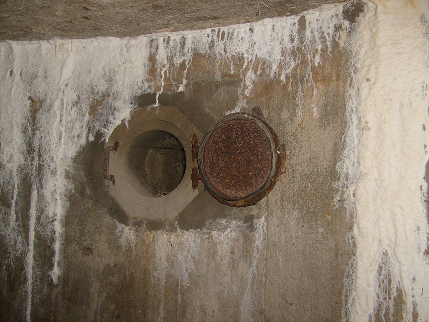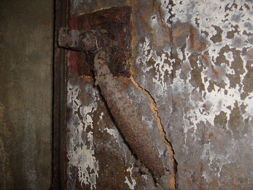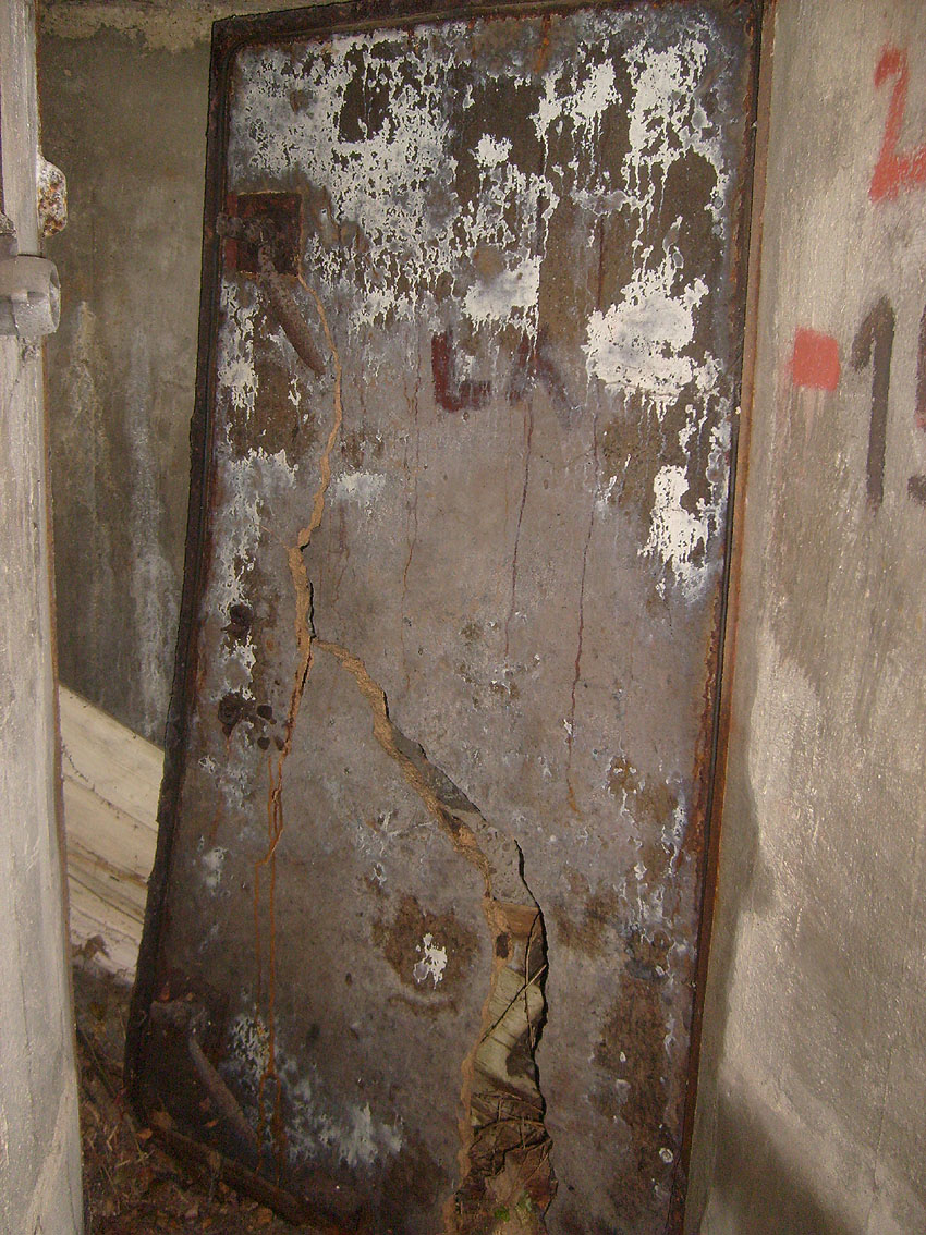 Die Tür besteht (wie bei vielen weiteren Oldenburger Rundschutzbauten) aus dem gleichen beton-artigen Verbundmaterial (eine härtere Version ähnlicher Zusammensetzung wie die heutige Gipsverbundplatte), wie z.B. jene Türen in den Gasschleusen der Wilhelmshavener Kriegsmarine-Truppenbunker gefertigt wurden. Stahl war bereits Mangelware. - Dieses Material, das ursprünglich extrem belastungsfähig war, ist günstiger / leichter zu beschaffen bzw. herzustellen gewesen.