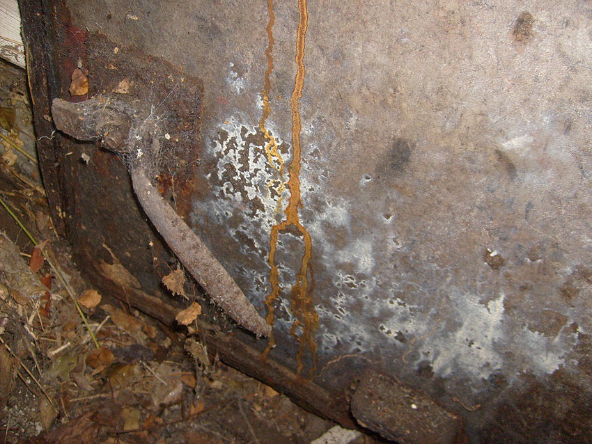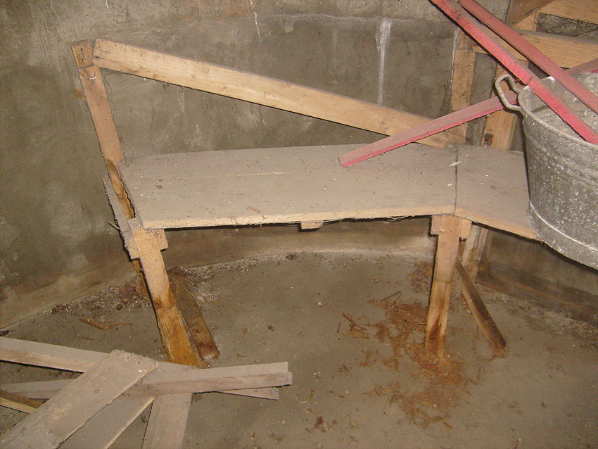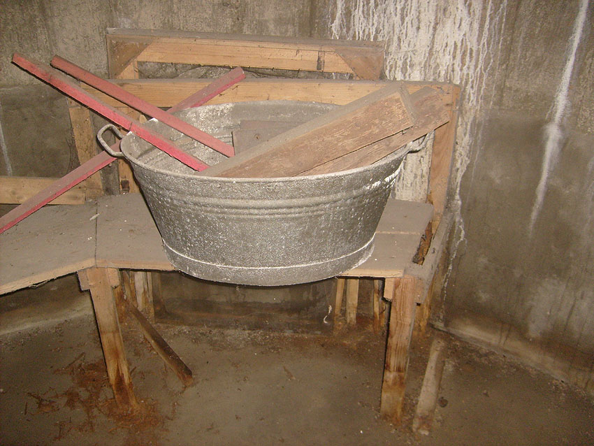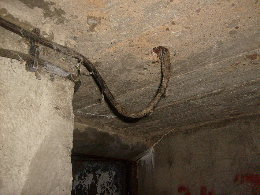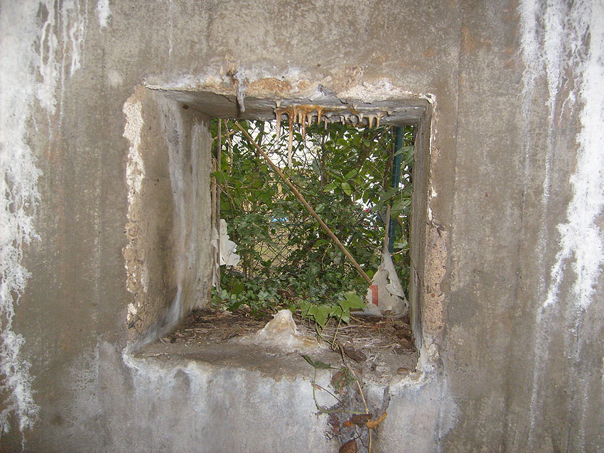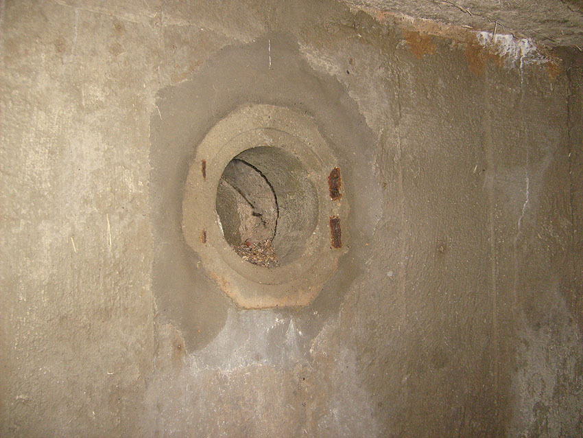 Die Tür besteht (wie bei vielen weiteren Oldenburger Rundschutzbauten) aus dem gleichen beton-artigen Verbundmaterial (eine härtere Version ähnlicher Zusammensetzung wie die heutige Gipsverbundplatte), wie z.B. jene Türen in den Gasschleusen der Wilhelmshavener Kriegsmarine-Truppenbunker gefertigt wurden. Stahl war bereits Mangelware. - Dieses Material, das ursprünglich extrem belastungsfähig war, ist günstiger / leichter zu beschaffen bzw. herzustellen gewesen.
