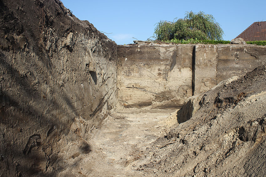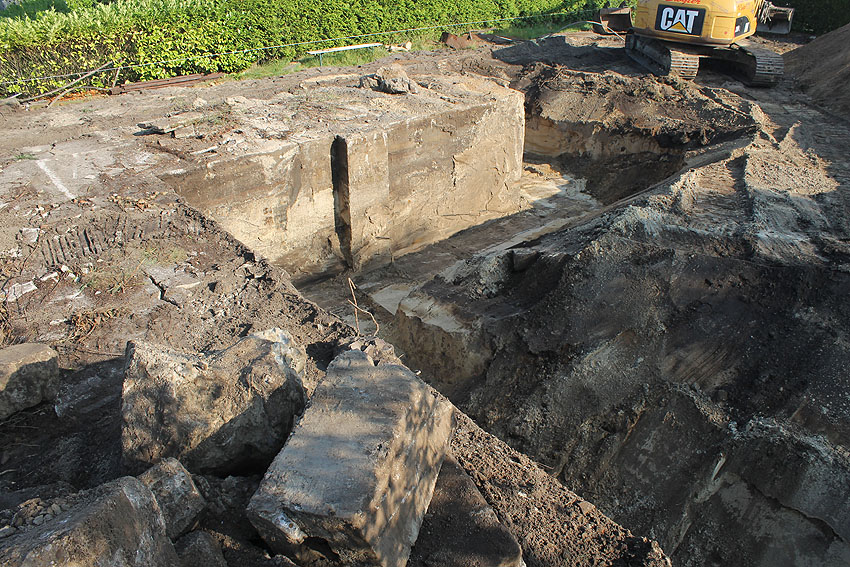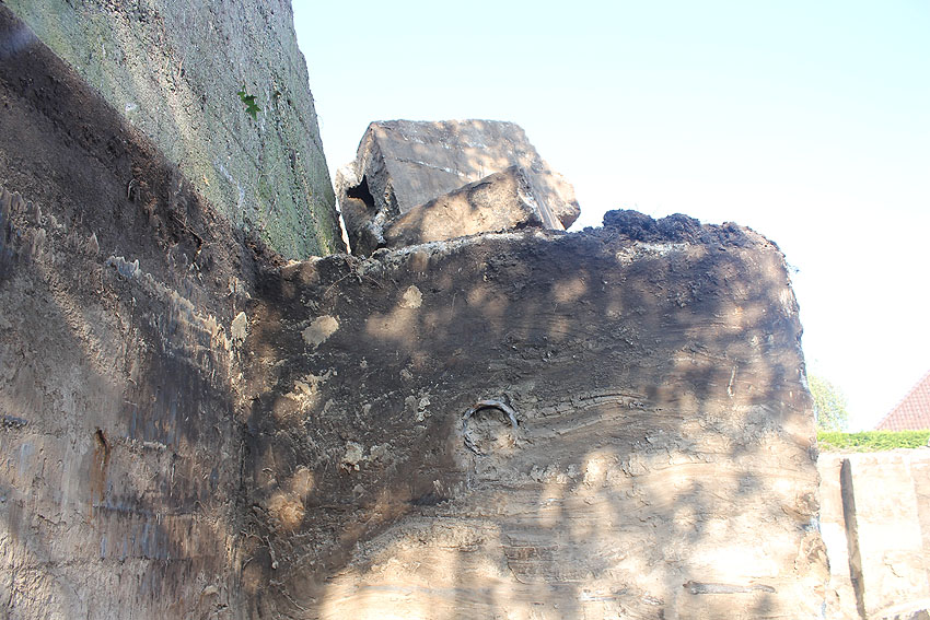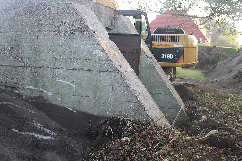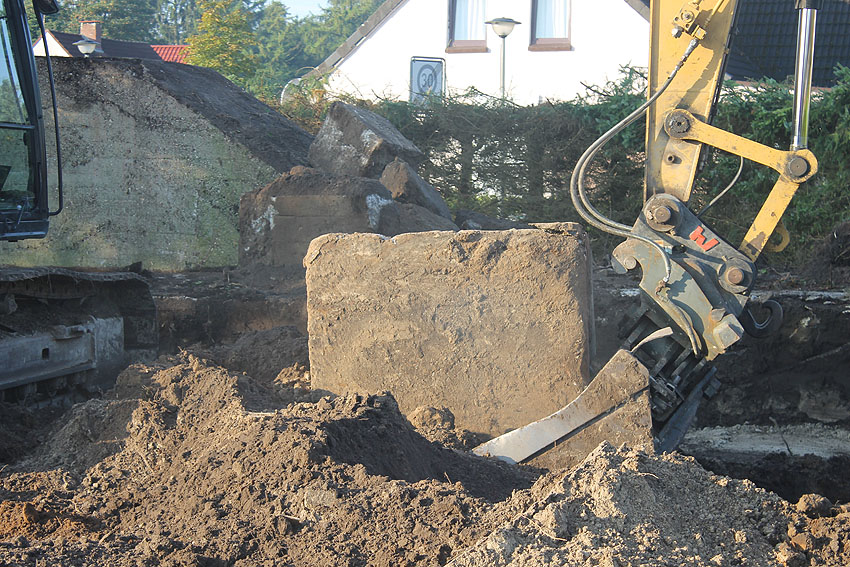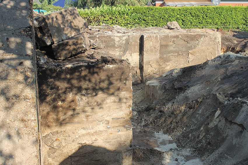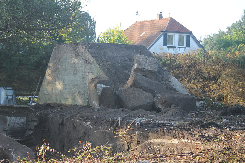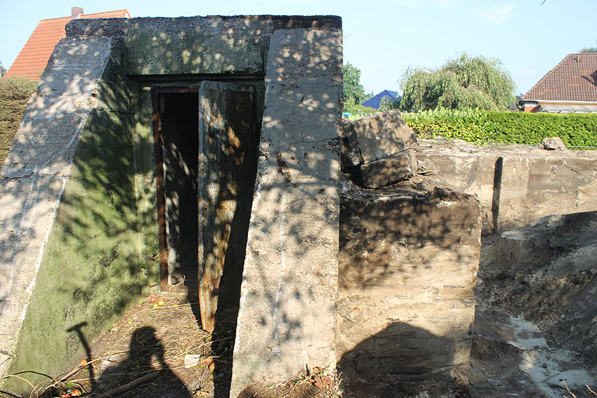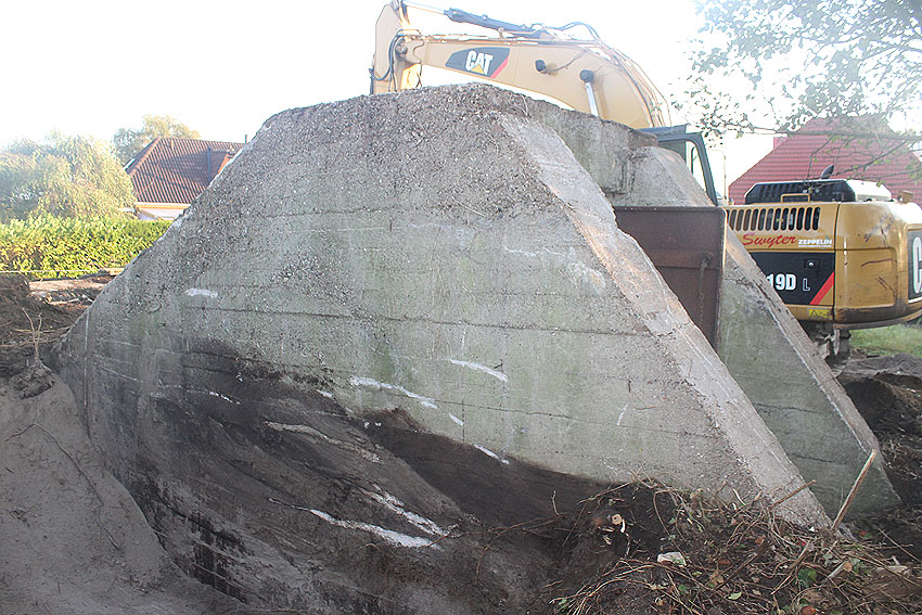 Am 7. und 8. September 2016 wurde nun der betonierte Deckungsgraben an der tom-Brok-Straße Ecke Bahnhofstraße in Schortens / Heidmühle abgerissen. Das Bauwerk konnte beim besten Willen nicht in das geplante Neubauvorhaben (Einfamilienwohnhaus) integriert werden und musste deshalb leider weichen. Der Abbruch erfolgte durch die Firma Swyter GmbH aus Jever. Wir hatten die Gelegenheit, den Abbruch ausführlich zu dokumentieren. Unser herzlicher Dank an den Eigentümer des Grundstückes, Herrn Bruns, für die Ermöglichung!