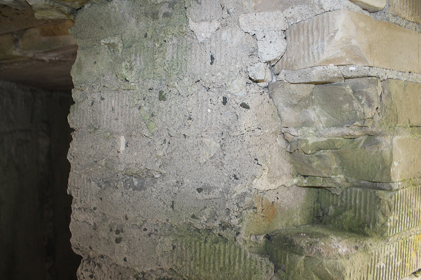Nachtrag 26.04.15: Es handelt sich hierbei nachweisbar um die Reste der ehemaligen Mittelsäule. Diese wurde wohl vor Jahren aus "Vandalismusgründen" zerstört. Siehe aktuelle Fotos weiter unten / an der Decke ist die ehemalige Aufnahmestelle der Säule noch zu sehen...