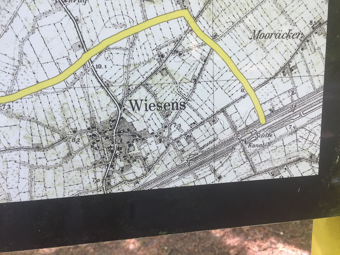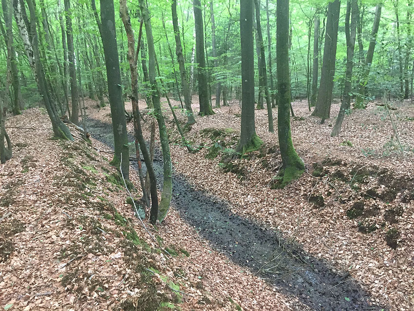 Die letzten Panzergrabenreste mit Gedenkstätte im Sandhorster Wald einige hundert Meter westlich der Bunker. Aufnahmen vom 26. Mai und 9. Juni 2023: