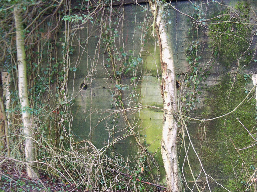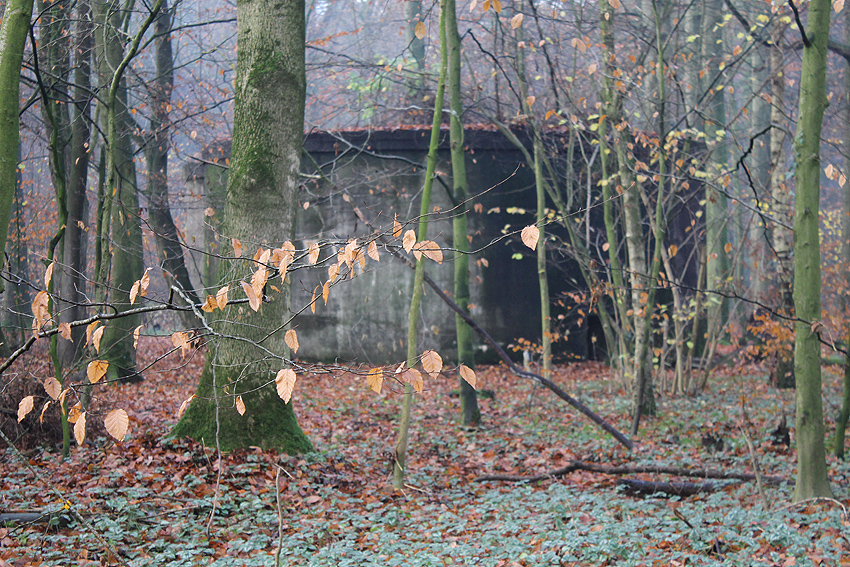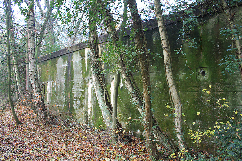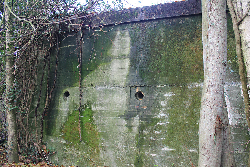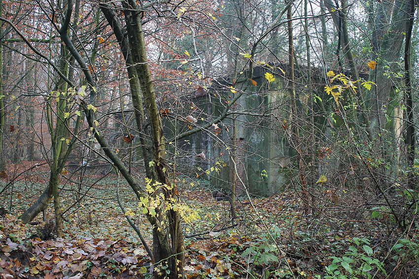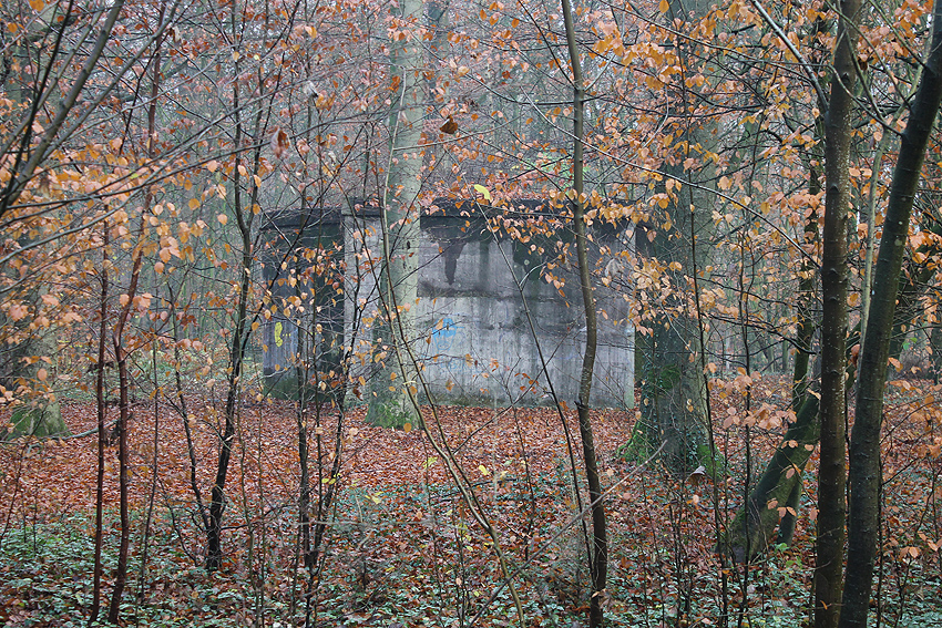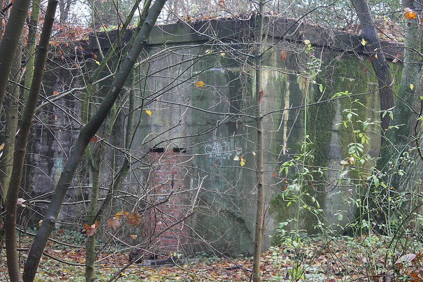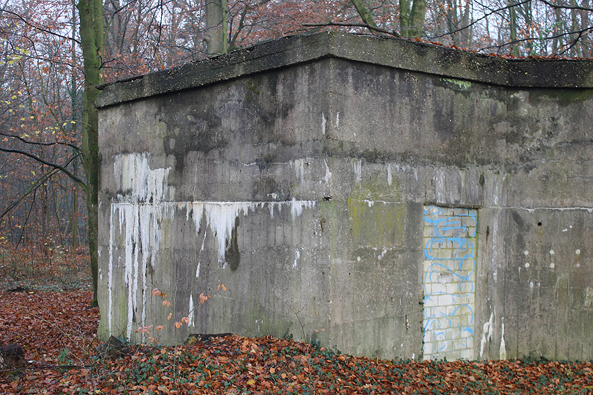 Ein rechteckiger, wohl bombensicherer Bunker (Kleinbunker) mit vier Eingängen (fast alle komplett zugemauert)...