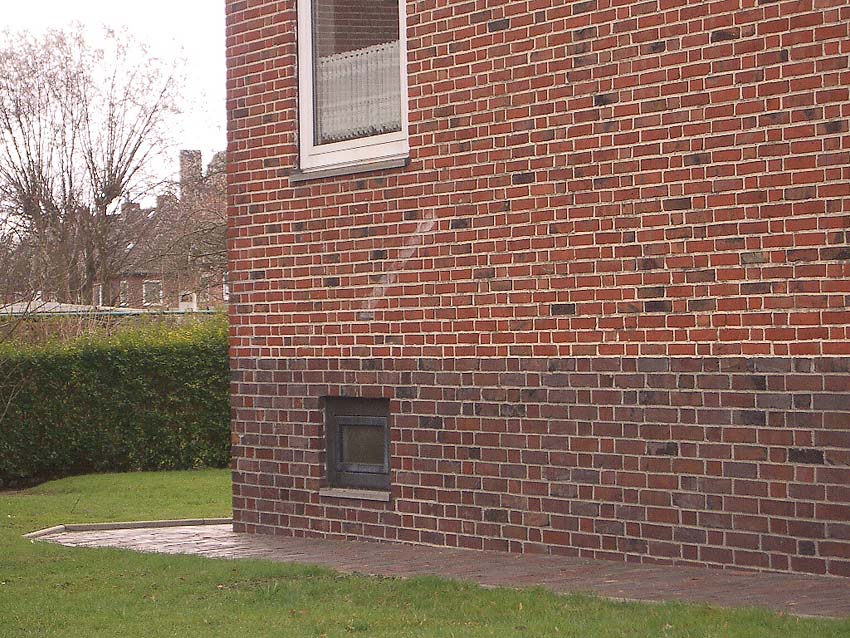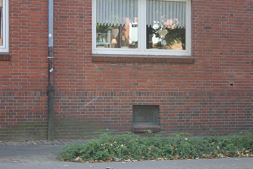 Wilhelmshaven / Kurpark / Bremer Straße 15 (im Hindenburgtor) / im Jahr 2023 erhalten (im Kellerfensterschacht dürfte sich im Krieg ein Mannesmann-LS-Gitter befunden haben / der geklinkerte Rand wird nach Ausbau des Gitters gefertigt worden sein)