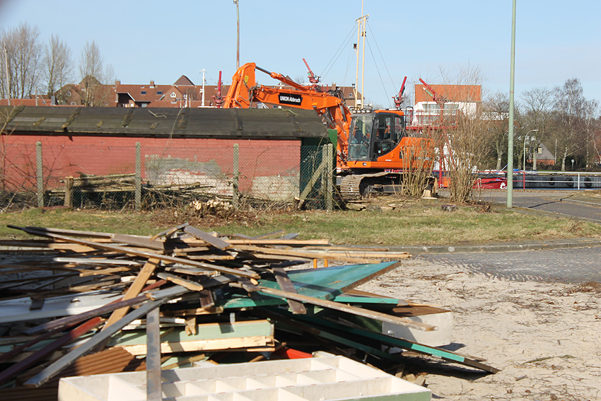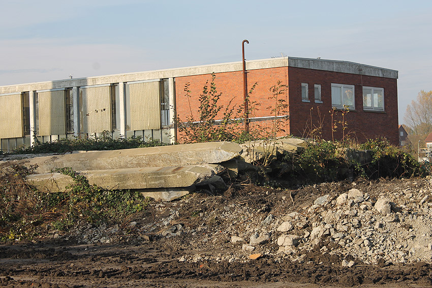 Es tut sich was. Die Stahlbetonfertigträger auf der Bunkerdecke wurden durch einen Bagger verschoben. Der Abrissbeginn dürfte näher rücken.