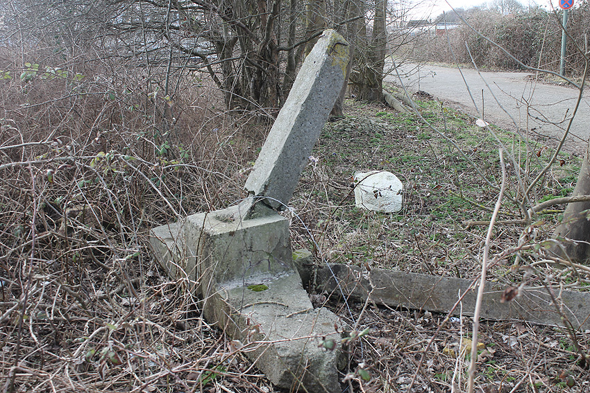 Nachtrag 12.02.18: Das "winkelförmige Massivbetonteil" hat sich nun als zwei nebeneinander liegende betonierte Tanks aus Nachkriegszeiten (BW) herausgestellt. Diese befanden sich ursprünglich unter Erdgleiche. Die beiden seitlich erkennbaren Öffnungen stellen Aufnahmen für Pumpleitungen / Abpumpen / Auffüllen eben dieser Boxen dar.