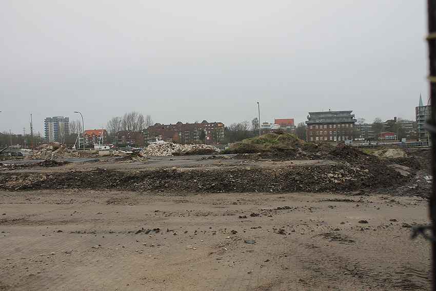 Alles ist abgerissen bis auf den Tiefbunker. Gewaltige Betontrümmer der Nachkriegsbauten-Fundamente türmen sich auf dem Gelände.