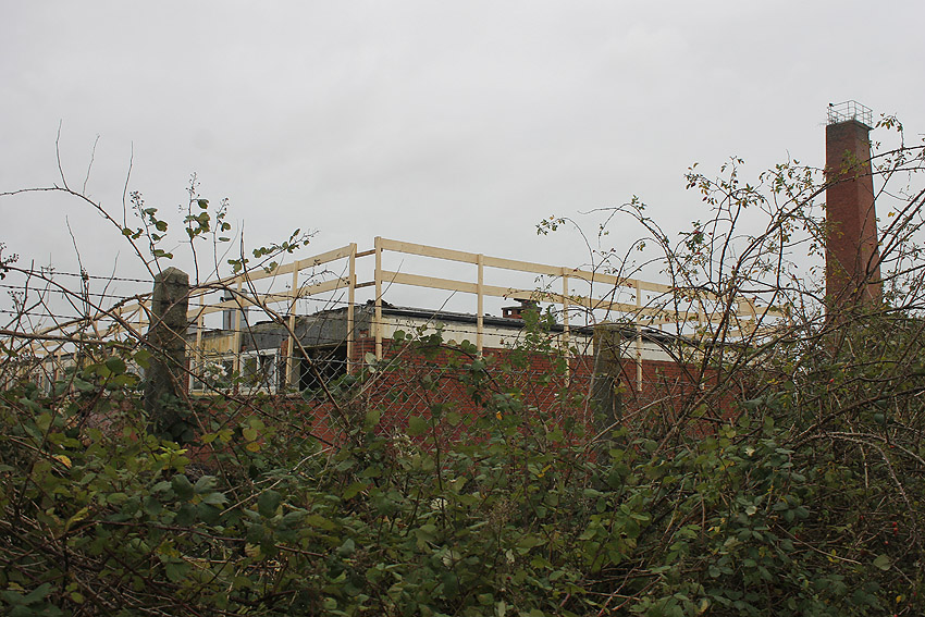 Das am Tiefbunker anliegende Heizwerk-Gebäude wurde bis auf den Schornstein abgerissen. Die Gebäudetrümmer lagern nun zunächst auf der Bunkerdecke.