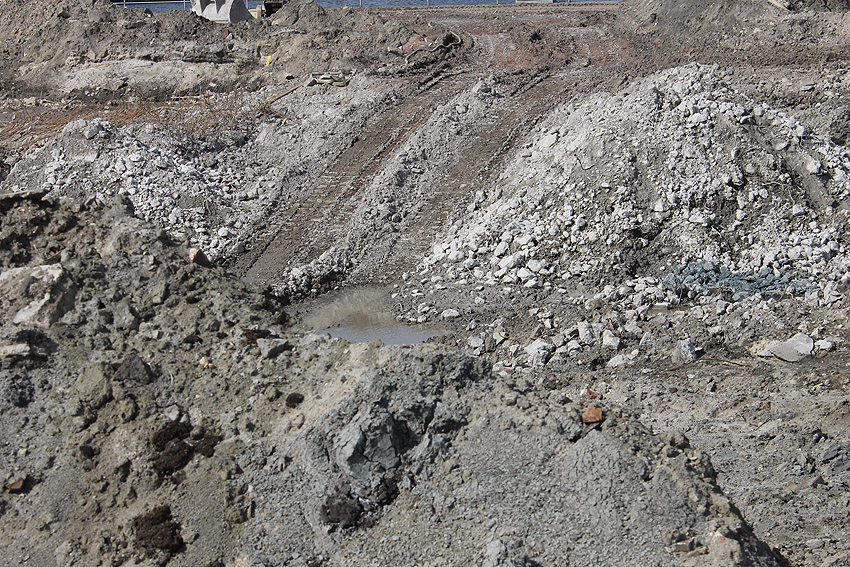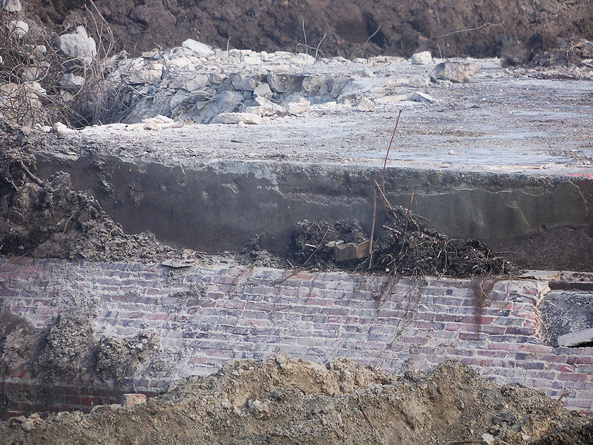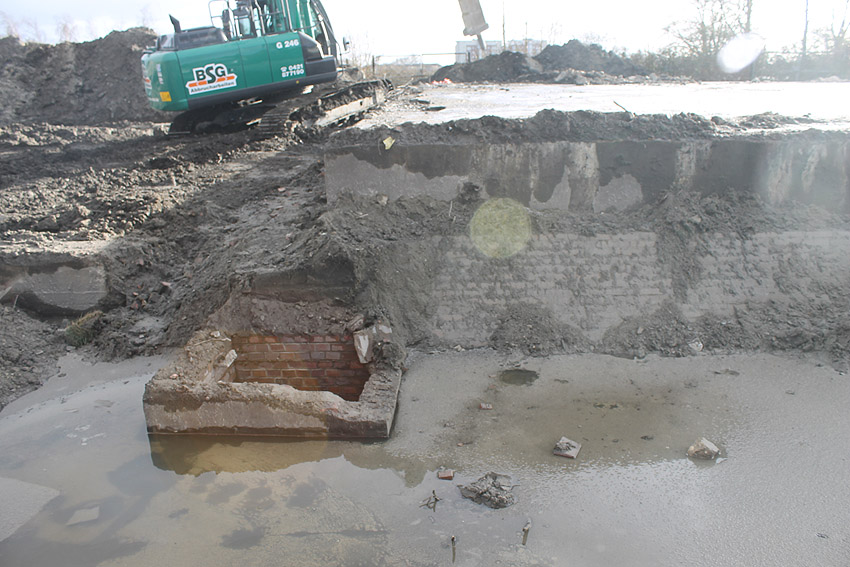 Wider Erwarten sind bis dato doch noch große Teile der Bodenplatte des Tiefbunkers erhalten geblieben. Nachdem das Grubenwasser nun abgepumpt wurde, ist die Platte freigelegt worden. Deren Abbruch ist in Arbeit.