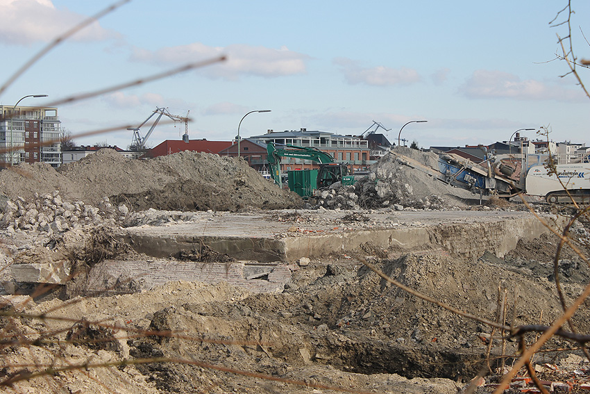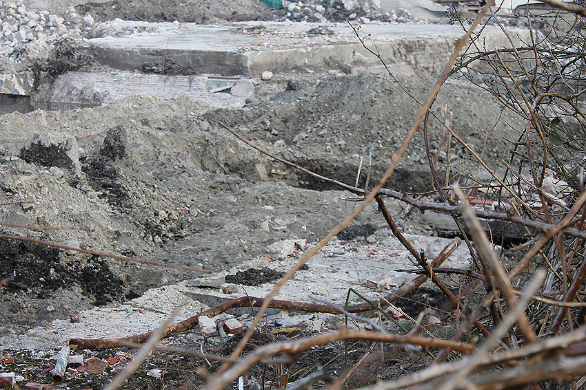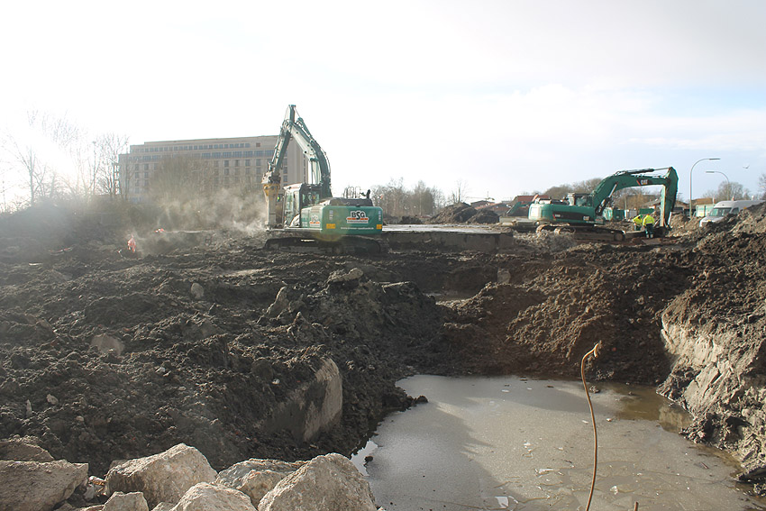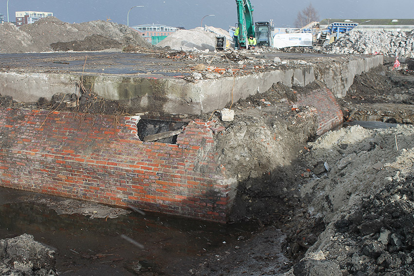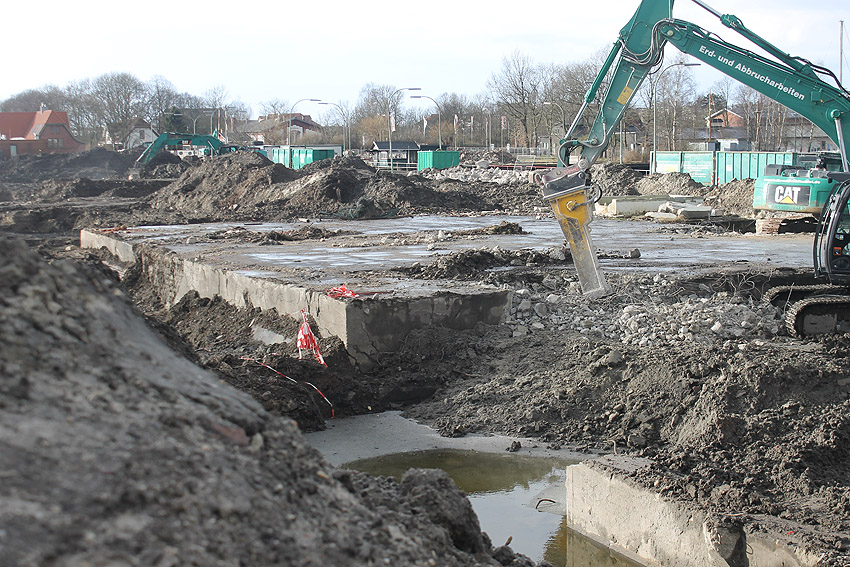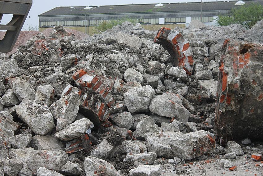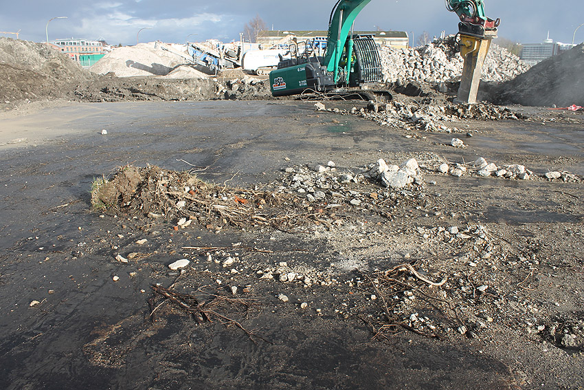 Die Sohlplatte des Tiefbunkers wird weiter abgebrochen. Hinweis: Die vermuteten Kranaufnahmen aus Stahlbeton, welche sich östlich des Bunkers befanden, wurden bereits vor einigen Wochen entfernt. Die Reste der Nordwestwand des Bunkers mit dem letzten "Rauchen verboten"-Schriftzug sind vor knapp zwei Wochen zerkleinert worden.