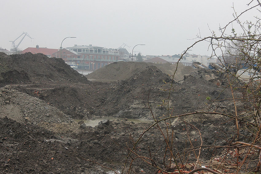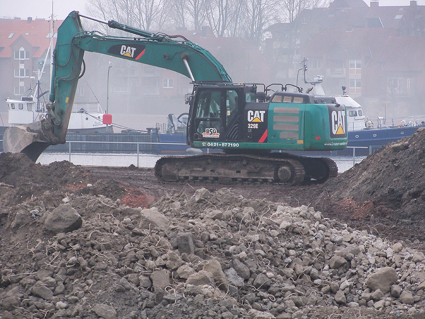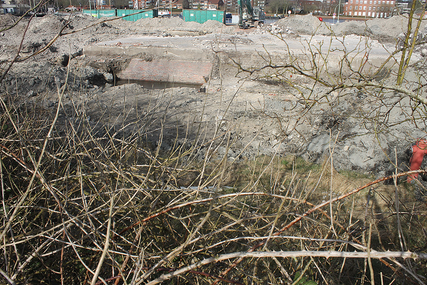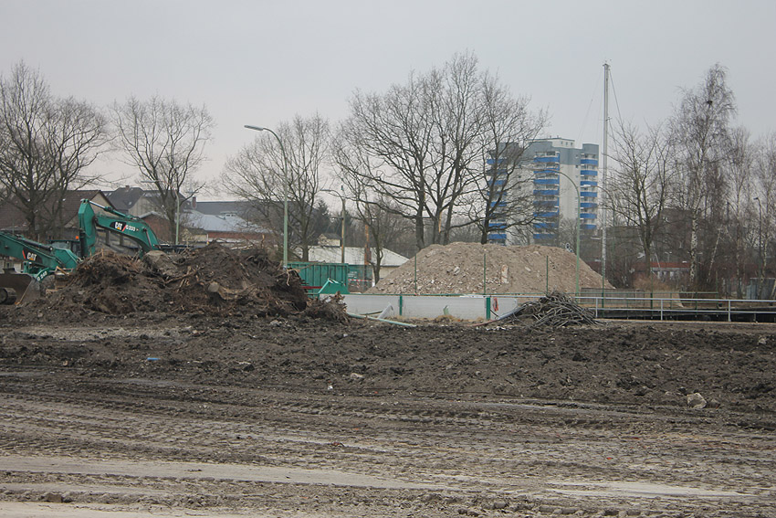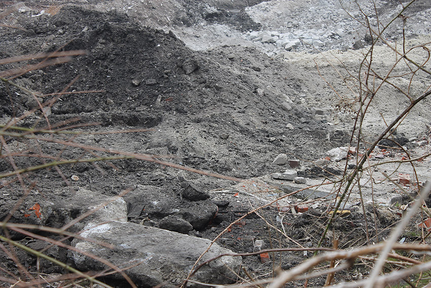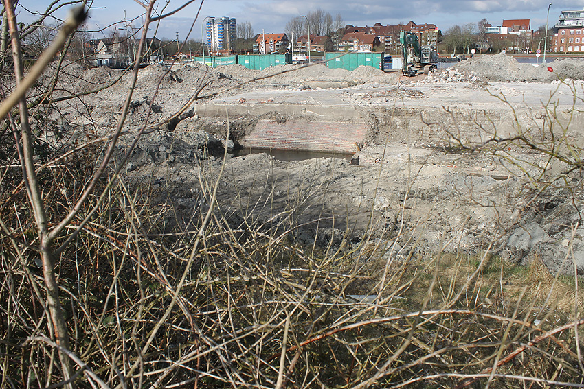Die Sohlplatte des Tiefbunkers wird weiter abgebrochen. Hinweis: Die vermuteten Kranaufnahmen aus Stahlbeton, welche sich östlich des Bunkers befanden, wurden bereits vor einigen Wochen entfernt. Die Reste der Nordwestwand des Bunkers mit dem letzten "Rauchen verboten"-Schriftzug sind vor knapp zwei Wochen zerkleinert worden.