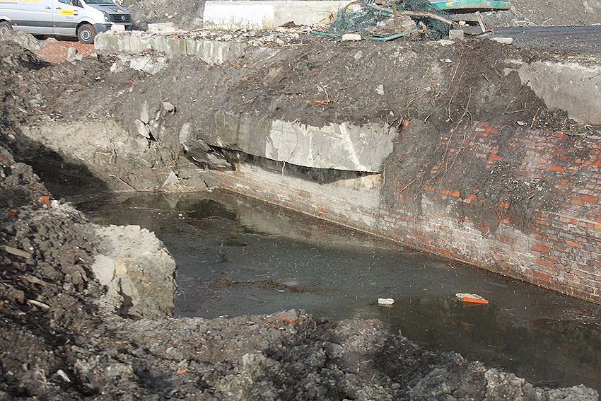 Die Bodenplatte des Tiefbunkers ist großteilig zerstört und damit nun Vergangenheit. Der Sohlbereich des Bunkers ist mittlerweile nicht unerheblich mit Grund- und Hafenwasser vollgelaufen.