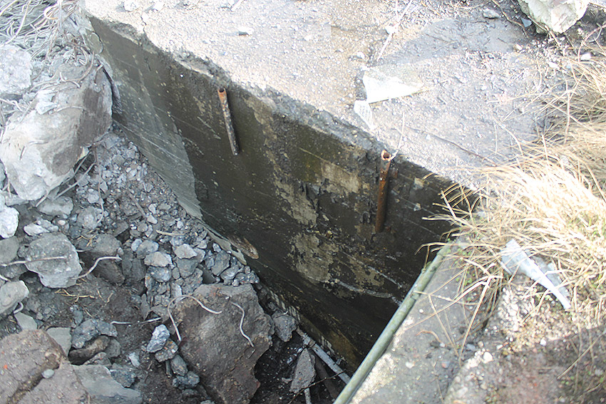 Nicht unerhebliche Teile der Ostdachecke des Tiefbunkers sind bereits abgerissen. An Objekt 2, welches wohl eine Zisterne darstellte, erinnert nur noch eine Erdkuhle mit einigen Trümmerstücken.