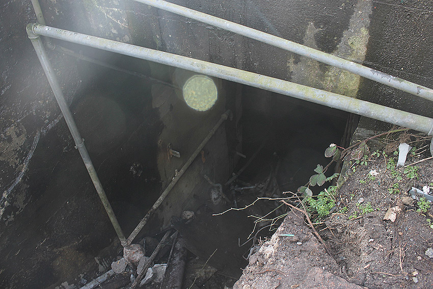 Unten: Hierbei könnte es sich um einen dritten Eingang des Tiefbunkers handeln, bzw. um einen nach dem Krieg bis auf Erdgleiche abgebrochenen Notausstiegsturm. Im Schacht sind Steigeisen vorhanden.