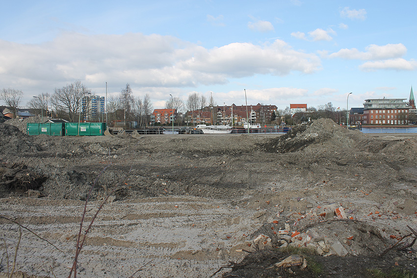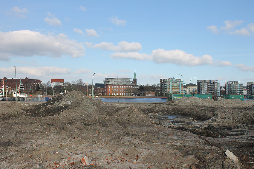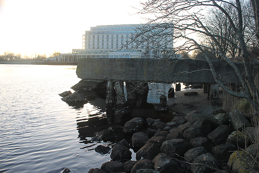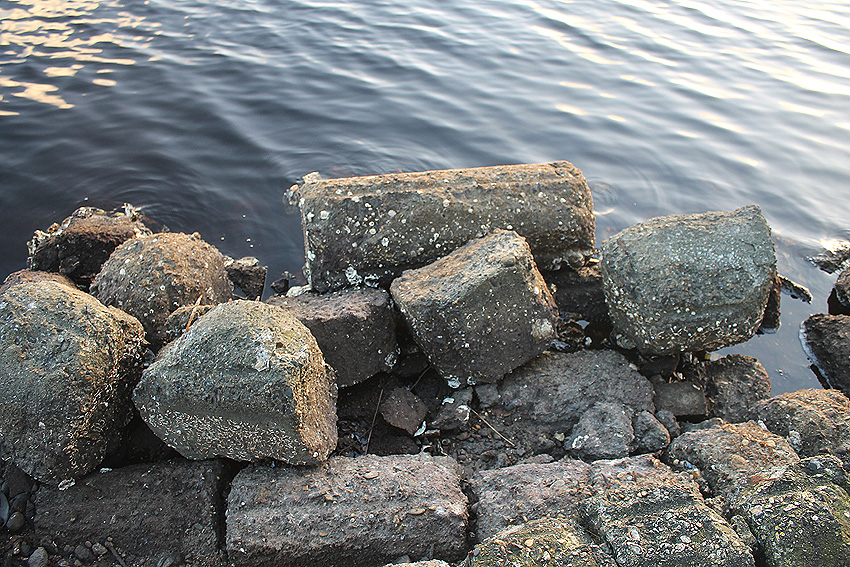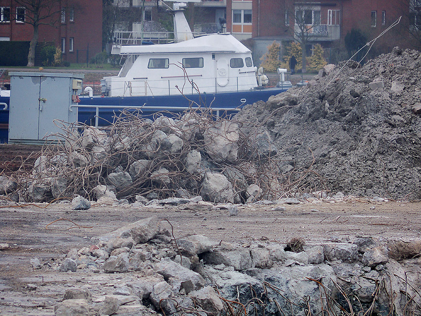 Kürzlich wurde der Wasserstand im Hafenbecken ein wenig abgesenkt. Zu sehen sind nun südlich an der Wiesbadenbrücke Trümmerrelikte, welche sonst die meiste Zeit unter der Wasseroberfläche verborgen liegen: