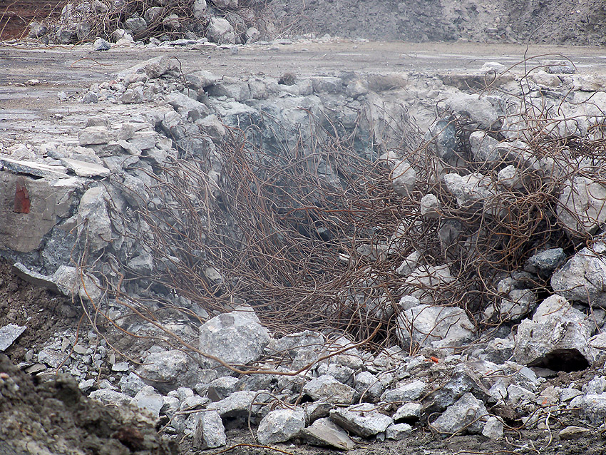 Mittlerweile ist die Decke des Tiefbunkers fast zur Hälfte abgebrochen. Zwei Bagger arbeiten sich mit dem Meißelhammer jeweils aus Osten und Norden vor. Die Höhe des Bunkers wurde inzwischen mit circa 5,50 Metern angegeben (+-1,50 m Decke - ohne nachträgliche Betonfertigträger - / 2,50 m Innenraumhöhe / 1,50 m Sohlplatte).
